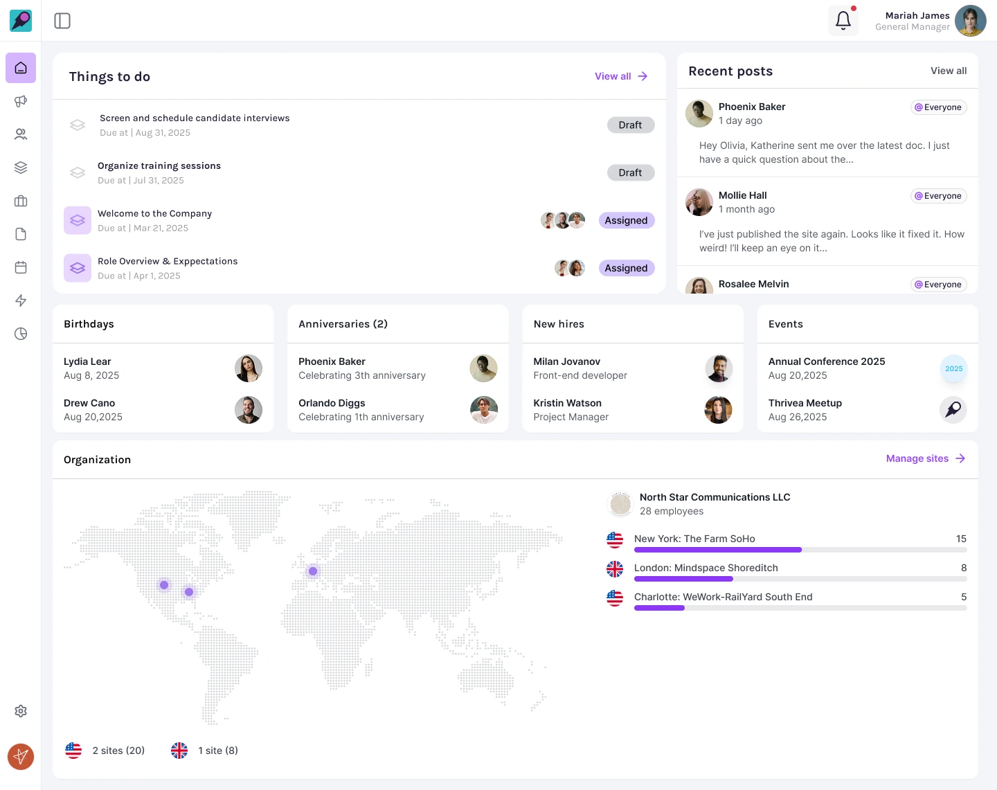 Thrivea covers core HR needs in one system: employee directory, communication, time-off, performance. No switching tools or building custom workarounds. Everything your team needs, built in from day one.