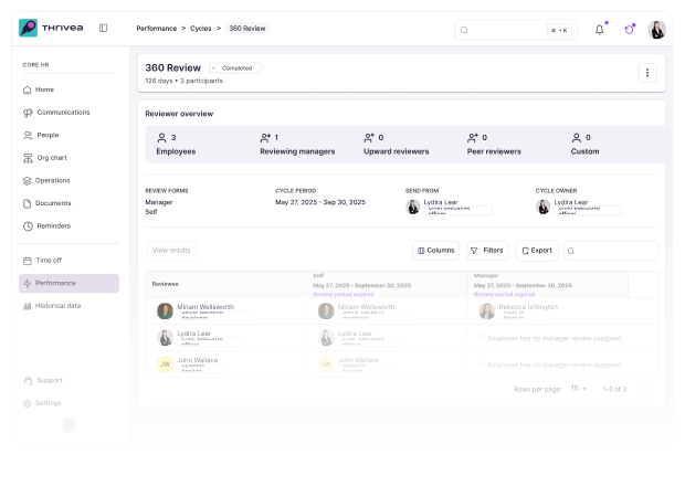 Thrivea is an all-in-one HRIS platform that helps growing teams manage employee data, time-off, performance, and workflows — all in one place.