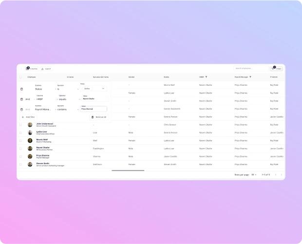 Segment your people data by department, location, tenure, and more — then save Custom Views for quick access anytime. From these views, you can apply bulk actions like updates or document exports, and export filtered data in flexible formats for audits, planning, or internal reporting.