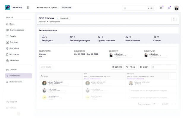 Thrivea combines intuitive workflows with powerful analytics, making it easy to launch structured review cycles, set clear goals, and keep everyone aligned.