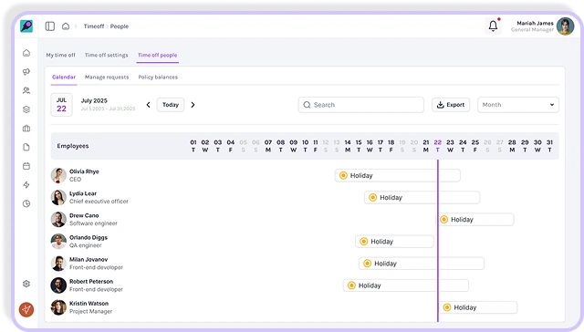Thrivea’s PTO tracking software helps HR teams save time, reduce errors, and create a seamless experience for managers and employees alike. From real-time dashboards to automated workflows, everything you need to handle time off with confidence is right here.